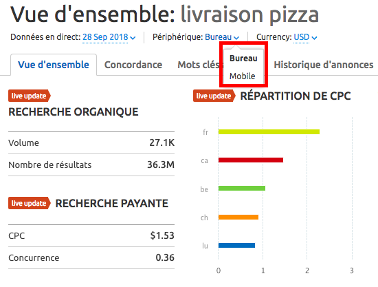 Par ailleurs, avec l’indexation "mobile-first" se dessinant à l’horizon, nous avons ajouté à nos outils des données analytiques mobiles pour 17 pays. Ainsi, si vous ciblez des clients à l’international, cette mise à jour est faite pour vous.