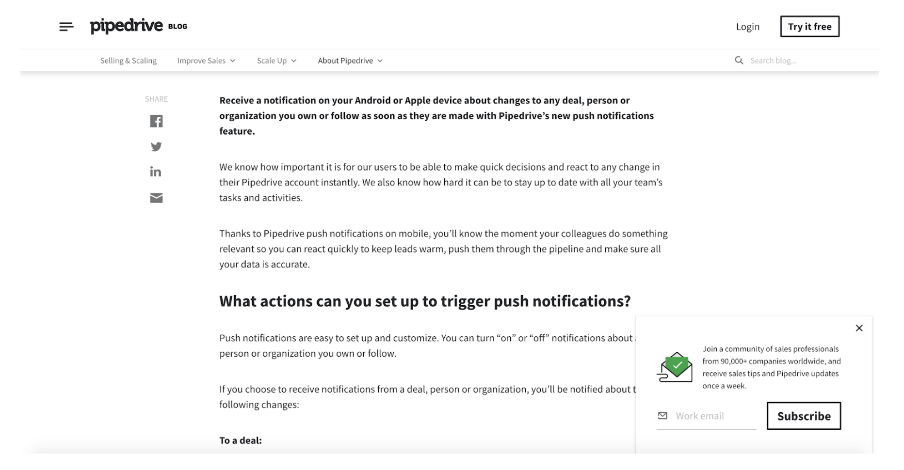 Um ótimo exemplo de uma marca que está fazendo um excelente trabalho de criação de conteúdo no estágio de conscientização é o Pipedrive. Eles criam e publicam conteúdos que aumentam a visibilidade da ferramenta SaaS entre suas personas de compradores-alvo e ajudam a resolver um problema.